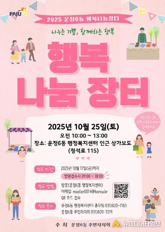 파주시 운정6동 주민자치회는 오는 25일 10시부터 13시까지 운정6동 행정복지센터 앞에서 주민과 함께하는 ‘제3회 행복나눔장터’를 개최한다.