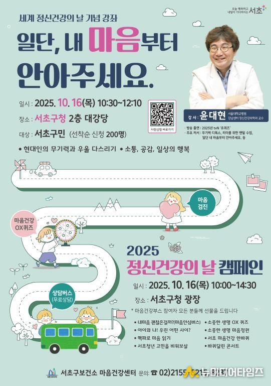 서울 서초구는 세계 정신건강의 날(10.10.)을 맞아 오는 16일 서초구청 대강당과 보건소 앞마당에서 정신건강 문제에 대한 구민의 인식을 제고하기 위해 ‘2025년 정신건강의 날 기념행사’를 개최한다고 밝혔다. 이번 행사는 ‘일단, 내 마음부터 안아주세요’라는 주제로, 구민들이 일상 속에서 자신과 타인의 마음 건강을 살피며 더불어 살아갈 수 있도록 돕는 데 중점을 두고 진행될 예정이다.