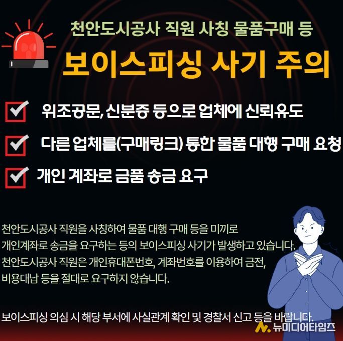천안도시공사가 최근 공사 직원을 사칭한 보이스피싱 사례가 발생함에 따라 피해 예방을 위한 주의를 당부했다.