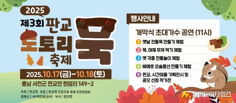서천군 판교면은 오는 10월 17일부터 이틀간 판교전통시장 일원에서 ‘제3회 판교 도토리묵 축제’를 연다.