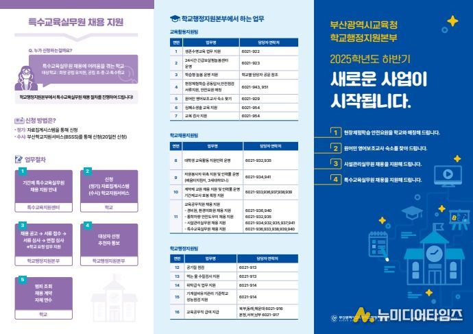 부산광역시교육청학교행정지원본부는 2025학년도 하반기부터 확대 시행되는 학교 지원 신규 사업 4가지를 소개하는 홍보 리플릿을 제작해 부산 관내 모든 학교에 배포한다고 14일 밝혔다.