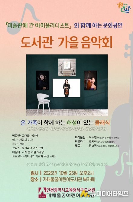 인천광역시교육청서구도서관은 10월 문화의 달을 맞아 오는 25일 오후 2시부터 3시까지 가재울꿈어린이도서관 1층 북카페에서 ‘도서관 가을 음악회’를 개최한다.