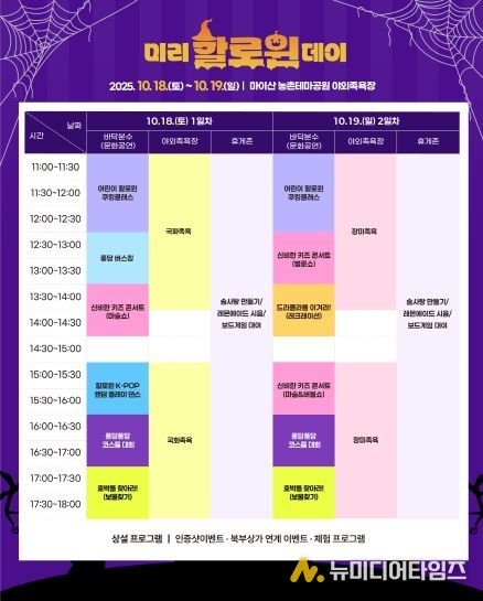 마이산 북부 야외족욕장에서는 매월 새로운 주제로 다양한 이벤트를 선보이고 있으며 이번 10월 특별 행사는 할로윈 데이를 주제로 △할로윈 코스튬 대회 △어린이 쿠킹클래스 △신비한 키즈 콘서트(마술&버블쇼) △할로윈 타로체험 등 다채로운 프로그램이 마련된다. 행사는 양일간 오전 11시부터 오후 6시까지 진행되며 일부 행사는 SNS 등을 활용해 사전 신청을 받아 운영된다.