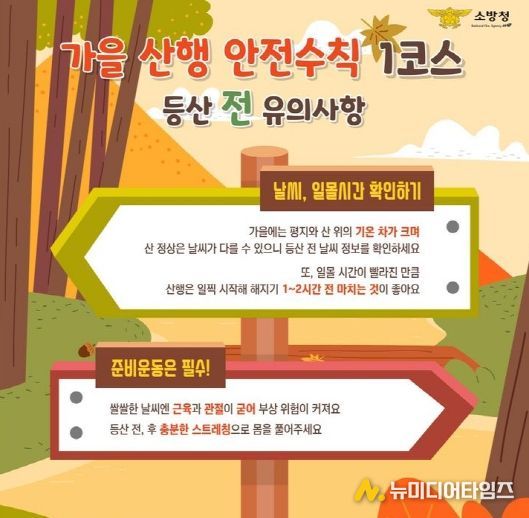 가을철에는 평지와 산 정상의 기온 차가 크고 일몰 시간이 빨라 안전사고 위험이 높아지는 만큼, 산행 전 기상정보와 일몰 시간을 반드시 확인하고, 해지기 1~2시간 전에 하산을 마치는 것이 좋다.