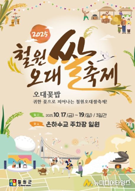 철원군은 10월 17일부터 19일까지 3일간 철원군 동송읍 장흥리 2721번지 은하수교 주차장 일원에서 『2025 철원오대쌀 축제』를 개최한다.