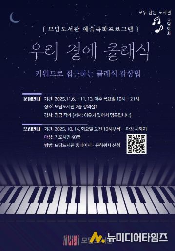 김포시 모담도서관은 클래식을 주제로 11월 6일부터 13일까지 매주 목요일 오후 7시부터 9시까지 특별 강연을 운영한다.
