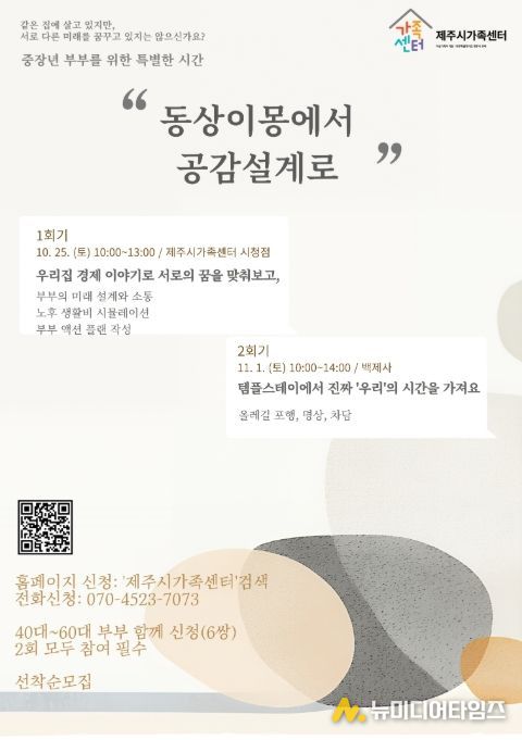 제주시는 제주시 가족센터와 함께 중장년 부부의 건강하고 행복한 가정생활을 지원하기 위해 ‘동상이몽에서 공감설계로’ 프로그램을 운영한다.
