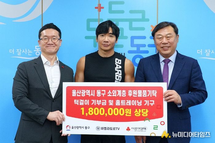 운동 유튜브 채널 ‘바벨라토르’(대표 이정희)가 10월 14일 오후 3시 동구청을 방문해, 지난 9월 13일 일산해수욕장 중앙광장에서 ‘턱걸이 왕중왕전’을 진행하고 모금한 기부금과 운동 물품 등 180만 원 상당을 동구에 기부했다.