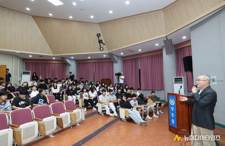 무주중학교 시청각실에서 개최된 이날 행사는 지역 내 학생들의 독서문화를 선도하고 인문학적 소양 증진에 기여하기 위해 마련된 것으로, 2025 무주군 올해의 책으로 선정된 청소년 부문 도서, “인권을 들어 올린 스포츠 선수들”의 저자 최동호 작가가 진행했다.