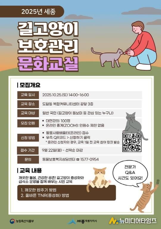 세종특별자치시가 오는 25일 도담동 행복누림터(복합커뮤니티센터) 강당에서 길고양이 보호관리 문화교실을 연다고 밝혔다.