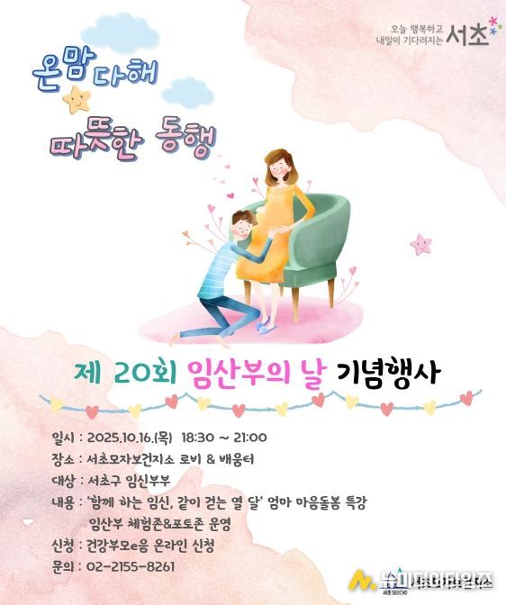 서울 서초구는 제20회 임산부의 날(10.10.)을 맞아 16일 오후 6시 30분부터 9시까지 서초보건지소에서 ‘온맘다해, 따뜻한 동행’을 주제로 기념행사를 개최한다고 밝혔다.