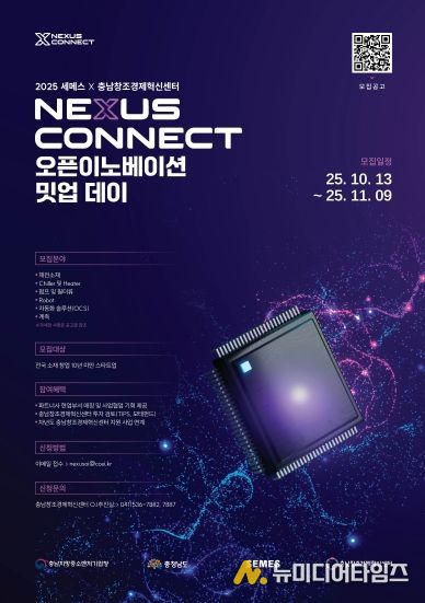 (재)충남창조경제혁신센터와 세메스(주)는 반도체·디스플레이 장비 혁신을 이끌 유망 스타트업을 발굴·육성하기 위해 ‘2025 세메스 × 충남창조경제혁신센터 Nexus Connect 오픈이노베이션 밋업 데이’ 참여 기업을 11월 9일까지 모집한다.
