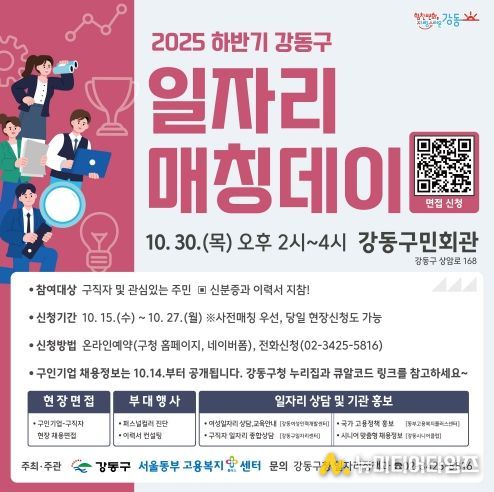 참여를 희망하는 구직자는 10월 27일까지 강동구청 누리집 또는 네이버폼을 통해 온라인으로 신청하거나, 강동구청 일자리정책과(02-3425-5816)에 전화로 접수하면 된다. 사전 신청을 놓친 경우에도 행사 당일 이력서와 신분증을 지참하면 현장 등록이 가능하다.