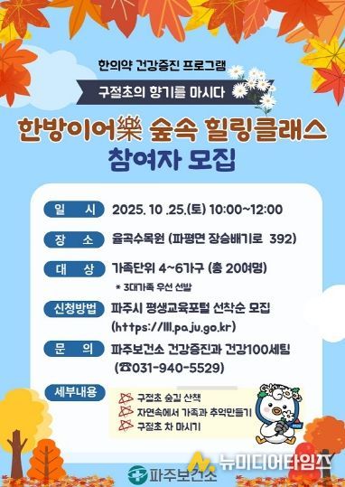 이한상 파주보건소장은 “자연과 함께하는 치유 프로그램을 통해 가족 간 유대감을 높이고, 건강한 생활 습관을 기를 수 있는 계기가 되길 바란다”라며 “많은 시민들의 적극적인 참여를 기대한다”라고 밝혔다.