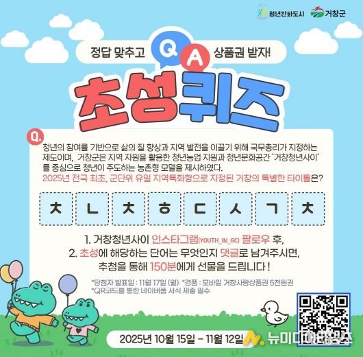 참여 방법은 간단하다. 우선 거창군 청년정책 공식 인스타그램 계정(@Youth_in_gc)을 팔로우한 뒤, 이벤트 기간 중 게시되는 초성 퀴즈 게시물에 정답 댓글을 남기고, 게시물 내 안내된 네이버폼 링크를 통해 이름과 연락처 등 인적 사항을 제출하면 된다.