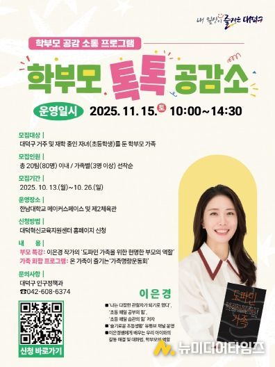 대전 대덕구는 오는 11월 15일 한남대학교 메이커스페이스 및 제2체육관에서 학부모와 자녀가 함께 참여하는 공감 소통 프로그램 ‘학부모 톡톡 공감소’를 운영한다고 밝혔다.