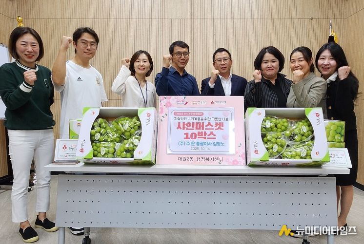 오산시 대원2동 행정복지센터는 지난 14일, ㈜주윤 김병노 총괄이사로부터 샤인머스캣 10상자를 기탁받았다고 밝혔다.