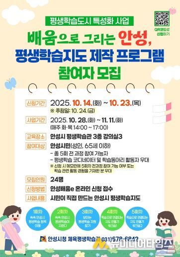 안성시는 시민 주도형 평생학습 프로그램인 '배움으로 그리는 안성 – 평생학습지도 제작 프로그램'을 오는 10월 28일부터 11월 11일까지 매주 화·목 14시부터 17시까지 안성시평생학습관에서 운영한다고 밝혔다