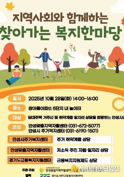안성시는 오는 10월 28일 오후 2시부터 4시까지 참아름아파트 5단지 내에서 ‘지역사회와 함께하는 찾아가는 복지 한마당’을 열고, 시민들을 대상으로 찾아가는 주거복지 이동상담소를 운영한다.