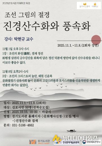 김포시 장기도서관은 2025년 도서관 지혜학교 특강으로 '조선 그림의 절경 진경산수화와 풍속화'를 오는 11월 1일, 11월 8일 오후 2시부터 5시까지 장기도서관 대강당에서 운영한다고 밝혔다