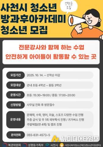 사천시 복지·청소년재단 소속 청소년방과후아카데미는 청소년의 안전한 방과 후 돌봄과 균형잡힌 성장을 지원하기 위해 신규 청소년을 모집한다고 15일 밝혔다.