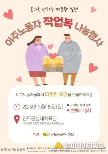 진도군은 오는 10월 19일에 진도군 실내체육관에서 외국인 근로자를 위한 겨울옷(작업복) 나눔 행사를 개최한다고 밝혔다.
