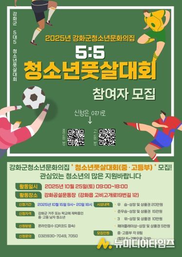 강화군시설관리공단(이사장 박영길)에서 운영하는 청소년 문화의 집이 오는 15일~20일, 관내 중․고등 남학생을 대상으로 강화군 청소년 풋살대회 참가자(팀)를 모집한다고 밝혔다.