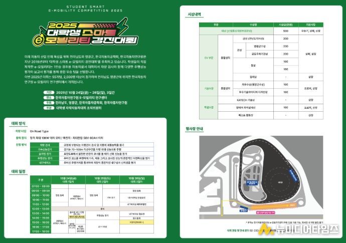 전라남도와 영광군, (사)한국자동차공학회는 오는 10월 24일부터 26일까지 3일간 영광군 대마면 한국자동차연구원 e-모빌리티 연구센터 일원에서 ‘2025 대학생 스마트 e-모빌리티 경진대회’를 개최한다고 밝혔다.