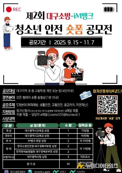 대구소방본부와 대구광역시교육청이 주최하고 iM뱅크, iM유페이가 후원하는 ‘제2회 대구소방-iM뱅크 청소년 안전 숏폼 공모전’이 오는 11월 7일까지 열린다.