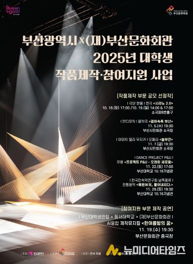 (재)부산문화회관(대표이사 차재근)이 부산광역시와 함께 지역대학생들과 청년예술인들을 위한 무대를 마련한다. 부산광역시 주최, (재)부산문화회관 주관으로 추진되는 '2025년 대학생 작품제작·참여지원 사업'은 2022년부터 시작되어, 대학 및 지역 내 다양한 재능을 가진 예비창작자들을 발굴 및 지원해오고 있다.