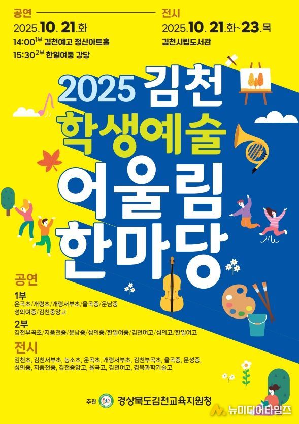 경상북도김천교육지원청은 오는 10월 21일 김천예술고등학교와 한일여자중학교에서 공연 행사를 열고, 김천시립도서관에서 전시 행사(21일-23일)를 통해 ‘2025 김천학생예술어울림한마당’을 개최한다.