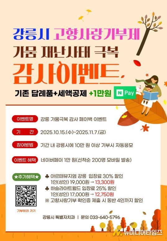 강릉시는 연말 기부 집중 기간을 맞아 고향사랑기부제 참여를 활성화하고, 지난 가뭄 극복 과정에서 전국 각지에서 보내준 따듯한 응원에 감사의 마음을 전하기 위해 “가뭄극복 감사 이벤트”를 진행한다.