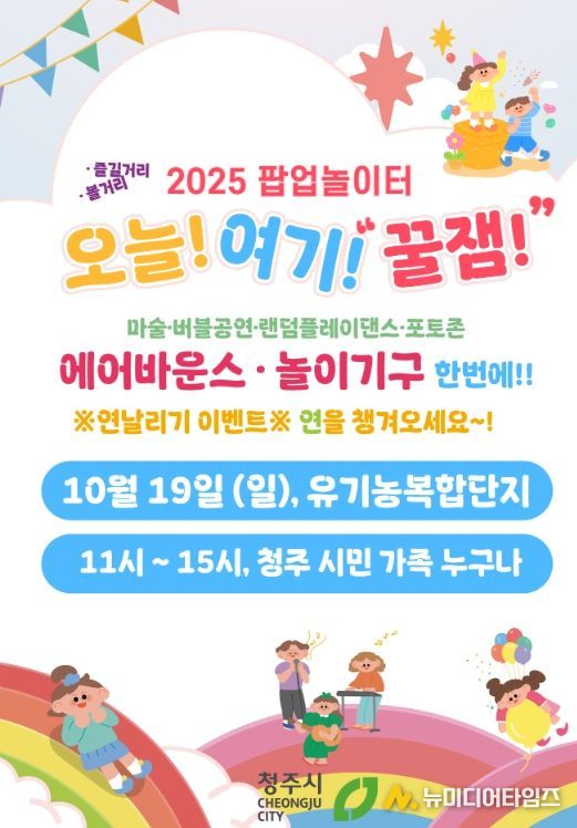 청주시는 오는 18일 개최 예정이었던 팝업 놀이터 ‘오늘! 여기! 꿀잼’을 비 예보로 인해 19일 오전 11시부터 오후 3시까지 유기농복합단지에서 운영한다고 밝혔다.
