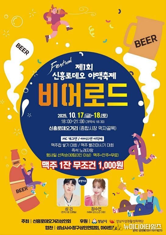 오는 17일과 18일 저녁 6시부터 9시까지 신흥로데오거리(종합시장 먹자골목)에서 열리는 ‘제1회 신흥로데오 비어로드 야맥축제’에서는 △맥주 빨리 마시기 대회 △맥주컵 쌓기 대회 △즉석 노래자랑 등 시민 참여형 이벤트가 다채롭게 진행된다. 특히 맥주는 소진 시까지 잔당 1000원에 판매될 예정으로, 많은 시민의 참여가 기대된다.