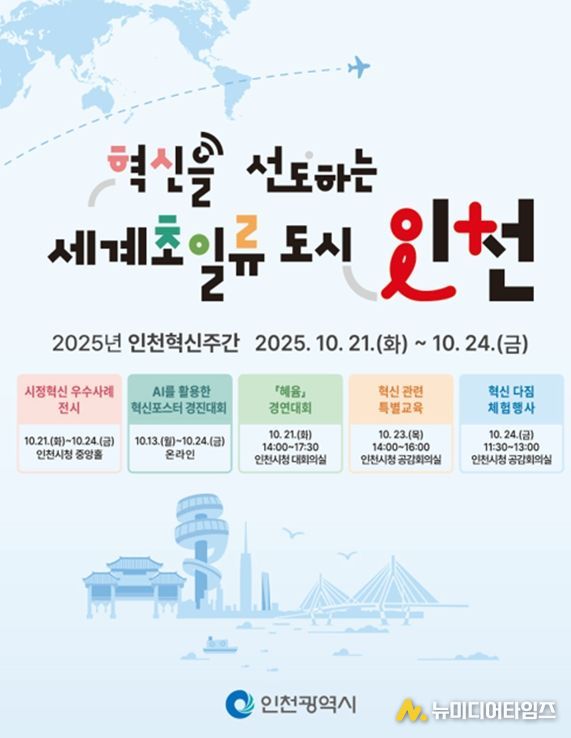 인천광역시는 혁신 행정의 성과를 확산하고 공직자의 혁신역량을 강화하기 위해 오는 10월 21일부터 24일까지 ‘2025 인천 혁신주간’을 개최한다고 밝혔다.