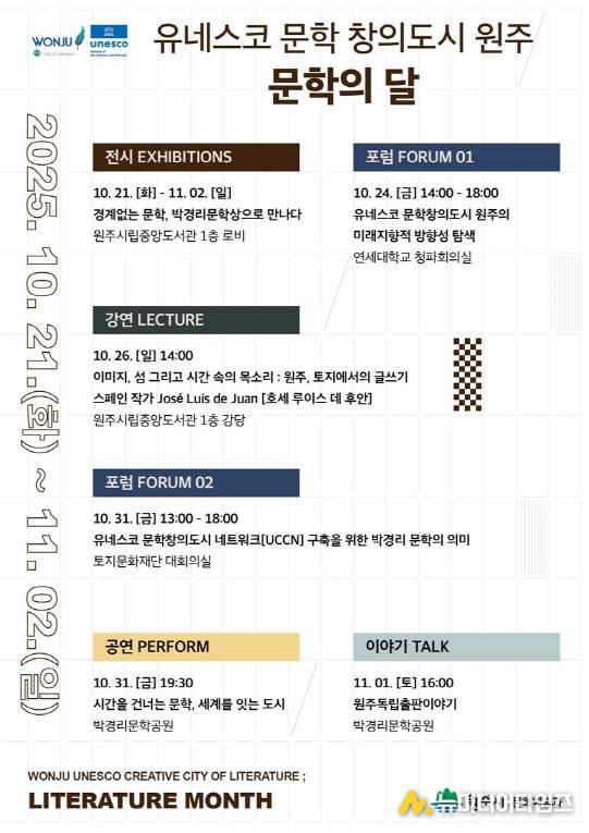 ‘유네스코 문학 창의도시 원주’가 오는 10월 21일부터 11월 2일까지 ‘시간을 건너는 문학, 세계를 잇는 도시’를 기치로'2025년 원주 문학의 달'행사를 개최한다.