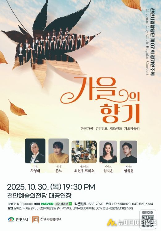 천안시립합창단이 오는 30일 오후 7시 30분 천안예술의전당 대공연장에서 제97회 정기연주회 ‘가을의 향기’를 개최한다.