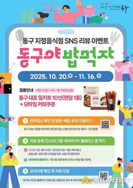 대구 동구청은 지정음식점 홍보와 외식산업 활성화를 위해 20일부터 11월 16일까지 4주간 ‘동구 지정음식점 홍보 SNS 인증샷 & 리뷰 이벤트’를 실시한다.