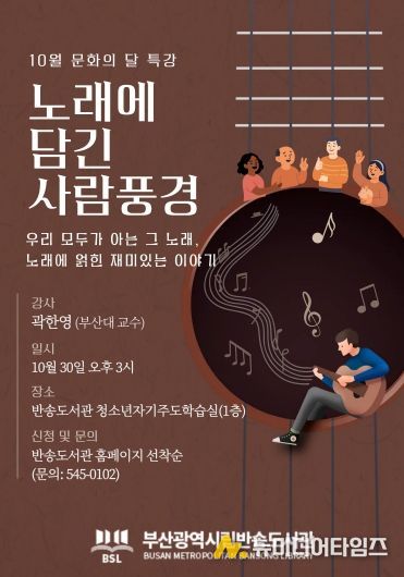부산광역시립반송도서관(관장 송애경)은 오는 30일 도서관 청소년자기주도학습실에서 지역주민 30명을 대상으로 인문학 특강 ‘노래에 담긴 사람풍경’을 운영한다.