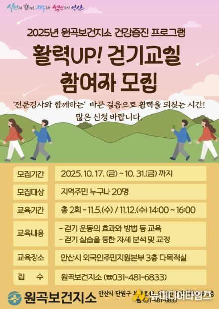 안산시 단원보건소 원곡보건지소는 오는 31일까지 ‘맞춤형 건강 프로그램 ’활력UP! 걷기교실’ 참여자를 모집한다고 16일 밝혔다.