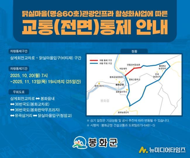 통제 구간은 삼계회전교차로 ↔ 닭실마을 입구(비티재)이며, 교통통제 기간 동안 삼계회전교차로 ⇄ 봉화읍내 ⇄ 36번국도(봉화교차로) ⇄ 36번국도(봉화한약우프라자) ⇄ 유곡삼거리 ⇄ 닭실마을입구(청암교)구간을 우회도로로 이용해야 한다. (지도사진 참조)
