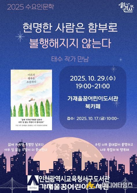 인천광역시교육청서구도서관은 10월 29일 오후 7시부터 9시까지 『어른의 행복은 조용하다』의 저자 태수 작가를 초청해 ‘수요인문학’ 강연 ‘현명한 사람은 함부로 불행해지지 않는다’를 진행한다.