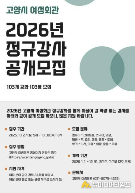 고양특례시 여성회관에서 2026년 정규강좌 운영을 위한 정규강사진을 공개 모집한다.