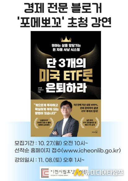 이천시 효양도서관은 시민들의 경제적 이해력 향상과 현명한 자산 관리 능력 제고를 위해 오는 11월 8일 오후 1시, '단 3개의 미국 ETF로 은퇴하라'의 저자이자 네이버 경제 전문 블로거 김지훈(필명 포메뽀꼬)을 초청해 재테크 특강을 진행한다.