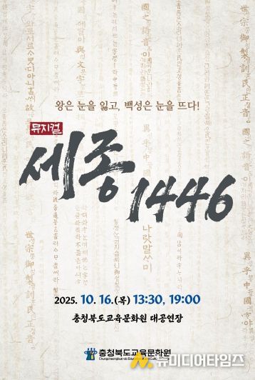 충청북도교육청 직속기관 교육문화원(원장 서종덕)은 16일, 2017년을 시작으로 경복궁 근정전에서 실경 뮤지컬까지 마친 대한민국 대표 창작뮤지컬인 '세종, 1446'을 학생들의 뜨거운 호응 속에 마무리했다고 전했다.