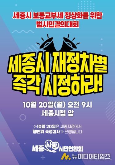 세종시 시민 대표들은 10월 20일 오전 10시, 세종시청 앞에서 행정안전위원회 국정감사 현장에 맞춰 기자회견을 열고, 국회의원들에게 “세종시의 보통교부세 불공정을 바로잡아 달라”고 강력히 호소한다.