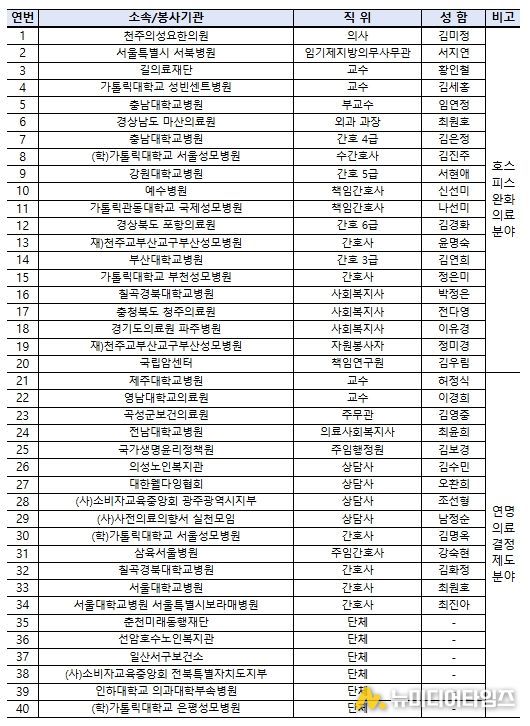호스피스·완화의료 분야에서는 호스피스·완화의료 연구 발전에 이바지한 가천대 길병원 황인철 교수, 가톨릭대학교 서울성모병원 김진주 간호사, 천주교부산교구부산성모병원 정미경 자원봉사자 등 총 20명에 대해서 장관 표창을 수여했다.