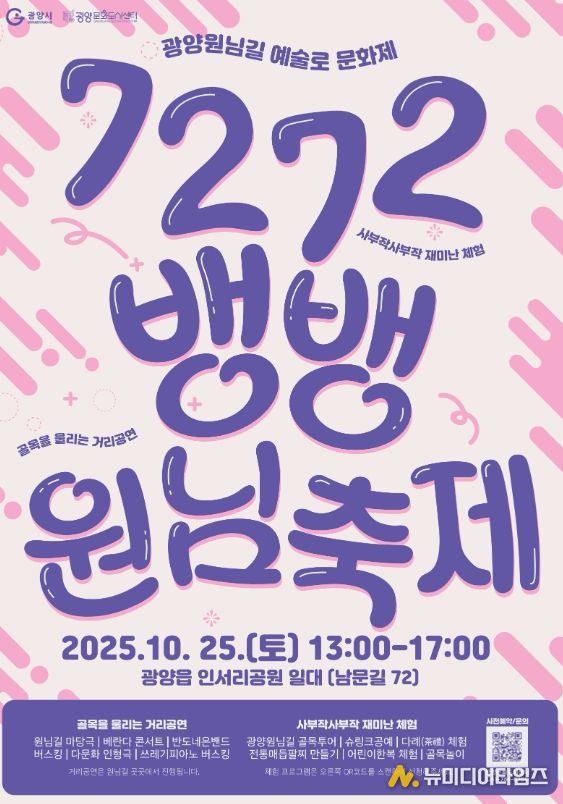 광양문화도시센터는 오는 10월 25일 금요일 오후 광양읍 인서리공원 일대에서 광양원님길 브랜드 축제 ‘7272뱅뱅원님축제’를 개최한다고 밝혔다.