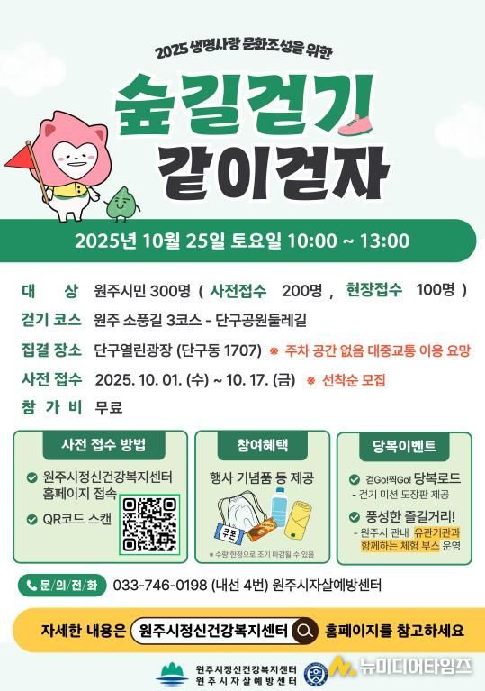 원주시정신건강복지센터 부설 자살예방센터는 오는 25일 오전 10시, 단구공원 둘레길에서 생명사랑 문화조성을 위한 숲길걷기 ‘같이 걷자’를 개최한다.