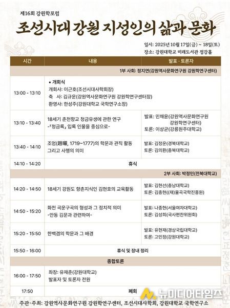 강원역사문화연구원 강원학연구센터는 2025년 10월 17일 오후 1시, 강원대학교 미래도서관 정강홀에서 제16회 강원학포럼 ‘조선시대 강원 지성인의 삶과 문화’를 조선시대사학회·강원대학교 국학연구소와 공동으로 개최한다.